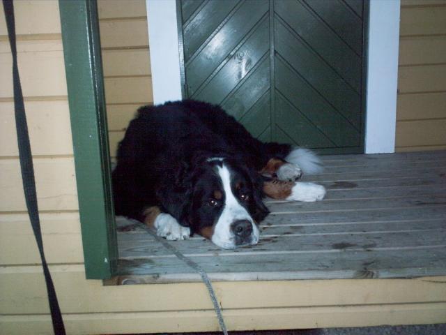Favoritvovve. Han vet inte om det än men när han reser sig upp så visar det sig att han fastnat med halsbandet mellan spjälorna i golvet och därför inte klarar att resa sig mer än 20cm utan att riskera att strypa sig.